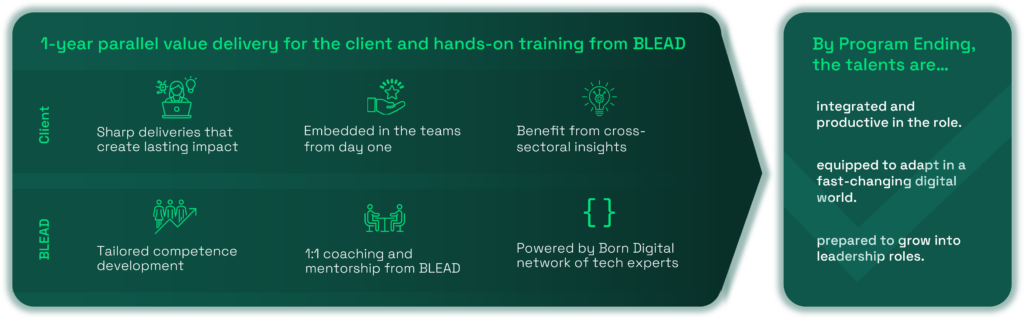 The talent receives role-specific training from BLEAD and our network of tech experts, building cross-functional business-tech skills and delivering immediate value with continuous coaching.