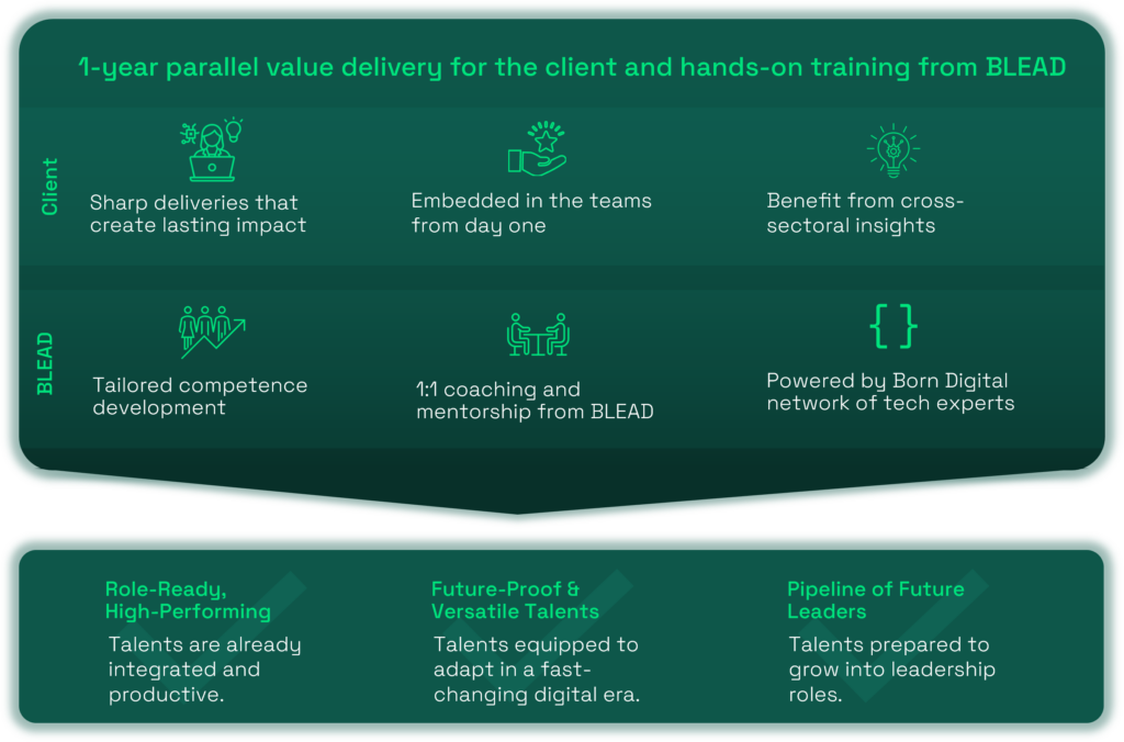BLEAD is your partner for future-ready talent at the intersection of business and tech! Our Talent Program helps organizations attract and develop future leaders who combine business insight with technical capability, building lasting competence within your own team.